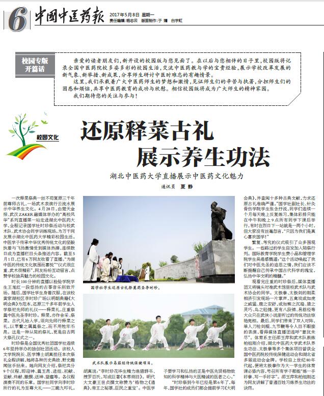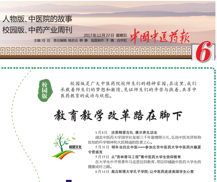 2017年5月8日,中国中医药报在校园专版开栏时,曾在头条作详细报道。